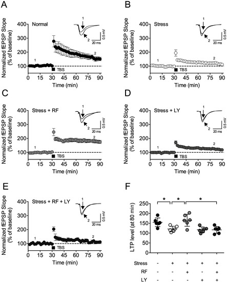 Effect of LY294002 on the effect of rubrofusarin on synaptic deficit: Long-term potentiation in the Schaffer-collateral pathway was induced by theta burst stimulation (TBS, 5 trains of 4 pulses at 100 Hz) after 30 min stable baseline. (A) Normalized fEPSP slop of normal group for 90 min. (B) Normalized fEPSP slop of CRS (stress) group for 90 min. (C) Normalized fEPSP slop of stress + RF (30 mg/kg) group for 90 min. (D) Normalized fEPSP slop of stress + LY294002 (LY, 1 nmol, 3 µL, i.c.v.) group for 90 min. (E) Normalized fEPSP slop of stress + RF (30 mg/kg) + LY (1 nmol, 3 µL, i.c.v.) group for 90 min. Data represented as mean ± SD. (F) Normalized fEPSP slop of each group during last 10 min. Data represented as mean ± SD with raw data. * p < 0.05.