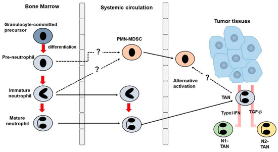 Presumed generation mechanism of tumor-associated neutrophils (TANs) and polymorphonuclear leukocyte (PMN)-myeloid-derived suppressor cells (MDSCs).