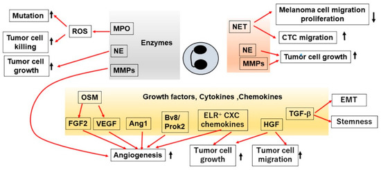 Neutrophils can produce various angiogenic or growth factors [4,5,43] (Figure 2). Vascular endothelial growth factor (VEGF) has a central role in tumor angiogenesis [64] and is stored intracellularly in human neutrophils [65]. Moreover, both human and mouse neutrophils can in vitro release VEGF in response to various stimuli such as tumor necrosis factor (TNF)-α, GM–CSF, G–CSF and neutrophilic chemokines [65,66,67,68]. The absence of IFN-β augmented intratumoral infiltration of CXCR2-expressing neutrophils [69], which abundantly produced VEGF and MMP-9 [70] and as a consequence, neutrophil depletion reduced tumor angiogenesis [70]. The expression of another angiogenic factor, angiopoietin 1 (Ang1), in human neutrophils has been documented [71]. However, it remains still elusive on the roles of neutrophil-derived VEGF and Ang1 in tumor angiogenesis and subsequent tumor growth. In collaboration with VEGF, fibroblast growth factor 2 (FGF)-2 can promote tumor angiogenesis [72]. In hepatic metastatic sites, TANs expressed abundantly FGF-2, which accelerated angiogenesis and eventually promoted liver metastasis growth [73].