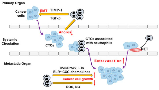 Metastasis proceeds through multiple processes [136]. Cancer cells at the primary site invade locally the adjacent tissues and intravasate into systemic circulation including blood and lymphatics, after undergoing EMT (Figure 4). CTCs extravasate through endothelial walls into the parenchyma of distant organs and form micrometastatic colonies, which subsequently develop into clinically detectable metastatic lesions [137]. The important roles of neutrophils in metastasis have been substantiated by the reduction of metastasis by neutrophil depletion in several animal models [138].