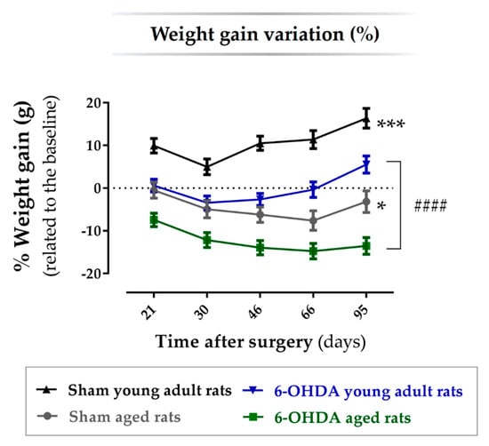 Percentage of body weight variation related to baseline at 21-, 30-, 46-, 66-, and 96-days post-surgery. The weight variation throughout the time of the experiment is statistically different between groups. Both young adult and aged 6-hydroxidopamine (6-OHDA)-lesioned animals had a significantly lower weight gain percentage along the experiment when compared with respective sham animals. Moreover, aged 6-OHDA-lesioned animals had a significantly lower weight gain when compared with young lesioned animals. n = 6 for the sham young adult rats group, n = 8 for the 6-OHDA young adult rats group, n = 5 for the sham aged rats group and n = 9 for the 6-OHDA aged rats group. Data are presented as mean ± SEM for each timepoint. #### p ≤ 0.0001 for the statistical difference between aged and adult young 6-OHDA-lesioned rats; * p ≤ 0.05, *** p ≤ 0.001 for sham animals statistically different from respective 6-OHDA groups. Abbreviations: 6-OHDA, 6-hydroxidopamine.