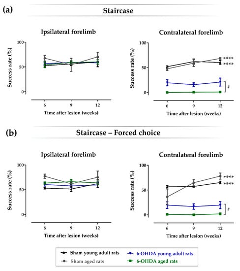 Staircase test. Both aged and young adult 6-hydroxidopamine (6-OHDA)-injected animals presented a significant impairment in the paw-reaching test performance regarding the contralateral forelimb when compared with the respective sham groups in both the double sides (a) and forced-choice task (b). Compared with 6-OHDA-lesioned young adult rats, paw reaching ability using the contralateral forelimb was more affected in lesioned aged animals for both the double sides (a) and forced-choice tasks (b). No differences between groups were observed in the performance of the ipsilateral forelimb for this behavioral test between all experimental groups. Furthermore, age per se did not have an impact on the skilled motor function of rats, since no significant differences were observed between young adult and aged sham animals for both the ipsi- and contralateral forelimbs. n = 5 for the sham young adult rats group, n = 5 for the 6-OHDA young adult rats group, n = 3 for the sham aged rats’ group, and n = 6 for the 6-OHDA aged rats group. Data are presented as mean ± SEM. # p ≤ 0.05 for the statistical difference between aged and adult young 6-OHDA-lesioned rats; **** p ≤ 0.0001 for sham animals statistically different from the respective 6-OHDA groups. Abbreviations: 6-OHDA, 6-hydroxidopamine.