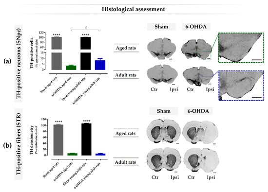 Histological assessment of 6-hydroxidopamine (6-OHDA)-induced nigrostriatal degeneration in young and aged animals. Quantification and representative micrographs of tyrosine hydroxylase (TH)-positive neurons and fibers in the substantia nigra pars compacta (SNpc) (a) and striatum (b), respectively. Results are presented as a percentage for the control side (non-lesioned hemisphere), showing a significant reduction of TH-expressing cells in 6-OHDA-lesioned animals in comparison to sham animals in the SNpc (a) and in the striatum (b). Multiple comparison analyses revealed a significatively more pronounced reduction in aged 6-OHDA-lesioned animals when compared with young adult lesioned animals in the SNpc (a). n = 6 for the sham young adult rats group, n = 8 for the 6-OHDA young adult rats group, n = 5 for the sham aged rats group, and n = 8–9 for the 6-OHDA aged rats group. Data are presented as mean ± SEM. # p ≤ 0.05 for the statistical difference between aged and adult young 6-OHDA-lesioned rats; **** p ≤ 0.0001 for sham animals statistically different from the respective 6-OHDA groups. Scale bar for (a) SNpc: 500 μm, and for (b) STR: 1mm. Abbreviations: CTR, contralateral; IPSI, ipsilateral; 6-OHDA, 6-hydroxidopamine; SNpc, substantia nigra pars compacta; TH, tyrosine hydroxylase; STR, Striatum.
