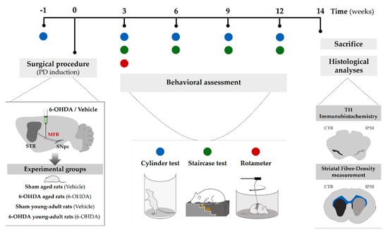The sequence of experiments carried out in this study is graphically outlined in Figure 5. Animals were assigned into four groups: young adult rats (n = 8; 10 weeks old; 6-OHDA young adult rats group) and aged rats (n= 9; 17 months old; 6-OHDA aged rats group) receiving unilateral 6-OHDA in the MFB, and young adult rats (n = 6; 10 weeks old; sham young adult rats group) and aged rats (n= 5; 17 months old; sham aged rats group) receiving vehicle infusion, used as controls for the respective lesioned groups. Firstly, all rats were subjected to one session of the cylinder test to obtain a pre-lesion baseline control to compare with sessions following the 6-OHDA lesion. After baseline testing for the cylinder test, animals underwent surgical procedures for either 6-OHDA or drug vehicle injection into MFB. Three weeks after surgery, the degree of the lesion was assessed in a series of motor behavioral tests, namely, the cylinder test, staircase test, and apomorphine-induced rotation test. Cylinder and staircase tests were repeated 6, 9, and 12 weeks after lesion surgery to evaluate the progression of the lesion along time. At the end of the behavioral assessment, animals were euthanized, and brains dissected and processed for TH histological analysis in the SNpc and striatum.