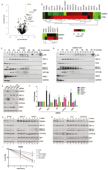 EDEM1 (ER-degradation enhancing α-mannosidase-like) turnover is modulated by ERAD (endoplasmic reticulum-associated protein degradation) proteins. (A) Volcano plot of proteins identified using mass spectrometry after enrichment with anti-EDEM1 antibodies from HEK293T cells overexpressing an empty vector (CTRL) or EDEM1 lysed in Triton-X100-containing buffer. Peptides were identified for three biological replicates, assembled in protein groups using MaxQuant, and the label-free quantification (LFQ) values were exported for further analysis. A t-test with permutation-based FDR correction was applied to select the statistically significant proteins. Black points represent background proteins, and light green represent significant proteins. EDEM1 is represented in black and bold text. The dash line indicates the threshold for statistically significant proteins (p < 0.05 and a minimum log t-test difference of 4 was considered). (B): All the identified proteins were annotated with Gene Ontologies (GO) biological processes terms from UniProt database, and only entries that contained the ERAD (upper panel) and protein folding (lower panel) key terms were further kept for analysis. The colour key denotes the mean of biological triplicates after the log transformation of the intensity/LFQ values. (C,D): HEK293T cells overexpressing EDEM1 treated or not with kifunensine were lysed in a Triton-X100-containing buffer and cleared lysates were subjected to separation on a 10–40% sucrose gradient. Equal volumes of sucrose gradient fractions that were TCA-precipitated and resuspended in 4% SDS buffer, treated (D) or not (C) with kifunensine were separated in reducing conditions by SDS-PAGE, transferred onto nitrocellulose membranes, and probed with the indicated antibodies: HA (for detecting EDEM1 glycosylated (g) and non-glycosylated (ng) forms), SEL1L, calnexin (CNX), OS-9 (for detecting OS-9.1 and OS-9.2), XTP3-B, HRD1, and GAPDH. (E): HEK293T cells were transfected with siRNAs targeting a non-specific sequence (CTRL), alongside siRNA for SEL1L, OS-9, XTP3-B, and HRD1 for 72 h. Cells were harvested, lysed in Triton-X100-containing buffer and processed for SDS-PAGE in denaturing conditions; the proteins were transferred onto nitrocellulose membranes and probed with antibodies for EDEM1, SEL1L, OS-9 (detecting OS9.1 and OS9.2), XTP3-B, HRD1, and CNX as internal control. (F): Band densitometry of images present in (E) are represented as mean of 3 independent experiments (n = 3 ± SEM) and one-way ANOVA comparison with Bonferroni correction was applied for statistical analysis (* p < 0.05, ** p < 0.01, *** p < 0.001, and **** p < 0.001). For simplicity of representation, only statistically significant samples are indicated. (G and H): HEK293T cells were transfected with siRNA targeting a non-specific sequence (CTRL), or siRNA-targeting SEL1L, OS-9, and XTP3-B for 72 h and treated or not (-) with kifunensine (kif) (30 µM/ON); 48 h post transfection cells corresponding to each condition were divided in 4 individual dishes and incubated for another 24 h. Next, the medium was changed with fresh medium supplemented with 50 uM cycloheximide and harvested at the indicated time points. Cells were lysed in Triton-X100-containing buffer, and an equal amount of protein from each sample was prepared for SDS-PAGE in reducing conditions. The levels of endogenously expressed EDEM1, alongside SEL1L, OS-9, XTP3-B, BiP, and calnexin (CNX) were assessed by Western blotting. (G): The control (siCTRL), SEL1L (siSEL1L) and OS-9 (siOS-9) siRNA transfected samples. (H): Control (-), kifunensine (+kif) and XTP3-B (siXTP3-B) siRNA treated cells. (I): Densitometry plot of EDEM1 bands from (G) and (H), represented as mean of 3 independent experiments (n = 3 ± SEM), and one-way ANOVA comparison with Bonferroni correction was applied for statistical analysis (* p < 0.05, ** p < 0.01, *** p < 0.001, and **** p < 0.001).