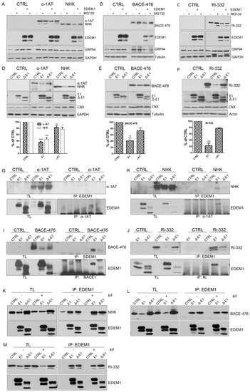 EDEM1 accelerates proteasomal degradation of ERAD substrates. (A) HEK293T cells co-expressing an empty vector (CTRL), α -1 antitrypsin (α-1AT), the Null Hong Kong (NHK) mutant with EDEM1, or an empty vector (-) were treated or not with MG132. The cells were lysed in Triton-X100-containing buffer, and an equal amount of protein was separated in polyacrylamide gels in reducing conditions for each sample. Protein expression was detected by Western blotting using antibodies against α-1AT that detected both the α-1AT wild type and NHK mutants, EDEM1, GRP94, or GAPDH. (B,C): The same experiment as in (A) was performed for BACE-476 (B) and Ri-332 (C). Proteins expression was detected by Western blotting using antibodies against BACE1 (B); ribophorin (C); EDEM1, GRP94, and tubulin (B); or GAPDH (C). (D): HEK293T cells co-expressing α-1AT or NHK with an empty vector (CTRL), EDEM1 (E1), or a ∆-EDEM1 (∆-E1) mutant were lysed in Triton-X100-containing buffer. An equal amount of protein from each sample was separated by SDS-PAGE, transferred onto nitrocellulose membrane, and probed with antibodies against α-1AT-detecting wild type form (α-1AT) and NHK mutants, EDEM1-detecting wild type (E1) and truncated (∆-E1) forms, calnexin (CNX), and GAPDH. The band densitometry of four independent experiments is presented in the graph to depict the level of α-1AT and NHK co-expressed with EDEM1 mutants (mean of n = 4 ± SEM), and two-way ANOVA comparison with Bonferroni correction was applied for statistical analysis (* p < 0.05, ** p < 0.01, *** p < 0.001, and **** p < 0.001). For simplicity only statistically significant samples are indicated. (E,F): Same experiment as for (D) was performed co-expressing BACE-476 (E) and Ri-332 (F) with an empty vector (CTRL), EDEM1 (E1) or ∆-EDEM1 (∆-E1) mutant and measured their expression by Western blotting, alongside CNX, tubulin (E), and actin (F). Band densitometry of 3 independent experiments is represented for each figure (mean n = 3 ± SEM), and two-way ANOVA comparison with Bonferroni correction was applied for statistical analysis (* p < 0.05, ** p < 0.01, *** p < 0.001, and **** p < 0.001). For simplicity of representation, only statistically significant samples are indicated. (G). HEK293T cells transiently transfected to co-express an empty vector (CTRL), EDEM1 (E1), and ∆-EDEM1(∆-E1) with α-1AT were lysed in CHAPS-containing buffer and the cell lysates were subjected to immunoprecipitation with antibodies for EDEM1 (upper panel) or α-1AT (lower panel). The eluted samples were separated by SDS-PAGE and probed with antibodies for the co-precipitated proteins. (H–J): Same as in (G) for NHK, BACE-476 and Ri-332, respectively, the eluted samples were separated by SDS-PAGE and probed with antibodies for the co-precipitated proteins α-1AT (H), BACE1 (I), Ribophorin I (J) (upper panels) and EDEM1 (lower panels). (K): HEK293T cells knock-out for EDEM1 were co-transfected with an empty vector (CTRL), EDEM1 (E1), ∆-EDEM1(∆-E1) and NHK, as in G and 24h after transfection kifunensine (kif) was added to half of the samples. Following, they were lysed in CHAPS-containing buffer, processed for immunoprecipitation with antibodies for EDEM1, and used for Western blotting with antibodies against α-1AT (upper panel) and EDEM1 (lower panel). (L) and (M) Same experiment as in (K) was performed for BACE-476 and Ri-332, respectively.