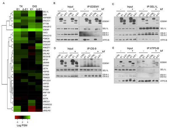 Association of EDEM1 and ∆-EDEM1 with ERAD partner proteins. (A). Heatmap representation of proteins identified by mass spectrometry after enrichment with anti-EDEM1 antibodies from HEK293T cells overexpressing EDEM1 or ∆-EDEM1 extracted in Triton X-100 (TX) or digitonin (DIG)-containing buffers. The identified proteins were annotated with GO terms from UniProt database, and only entries that contained the ERAD key-term were further kept for analysis. The colour key denotes spectral counts (SC) in log scale after negative control (cells transfected with an empty vector and immunoprecipitated with EDEM1 antibodies) subtraction. (B–E). HEK293T cells were transfected to overexpress an empty vector (CTRL), EDEM1 (E1), and ∆-EDEM1 (∆-E1), and they were treated or not with 30 µM kifunensine (kif) ON. Cells were harvested, lysed in CHAPS-containing buffer, and equal amounts of protein were used for immunoprecipitation with antibodies for: (B) EDEM1, (C) SEL1L, (D) OS-9, and (E) XTP3-B. The eluted resin-bound complexes were separated by SDS-PAGE, and the membranes were probed with antibodies for EDEM1, SEL1L, OS-9, and XTP3-B.