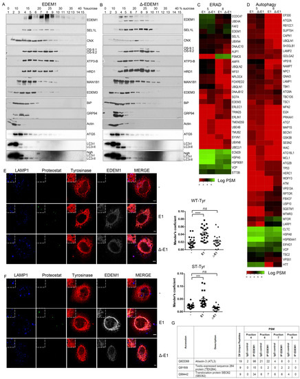 EDEM1 induces the formation of aggregates and targets them for degradation by ER-phagy. (A,B) Cells overexpressing EDEM1 and ∆-EDEM1, respectively, were lysed in Digitonin-containing buffer, and cleared lysates were subjected to separation on a 10–40% sucrose gradient. Equal volumes of sucrose gradient fractions that were TCA-precipitated and resuspended in 4% SDS buffer were separated in reducing conditions by SDS-PAGE, transferred onto nitrocellulose membranes, and probed with antibodies against the indicated proteins: EDEM1, SEL1L, calnexin (CNX), OS-9, XTP3-B, HRD1, MAN1B1, EDEM3, BiP, GRP94, Actin, ATG5, and low exposure (LC3-I and II) and high exposure (high LC3-I and II) LC3. Heatmaps of ERAD (C) and autophagy (D) identified proteins using mass spectrometry in two sucrose gradient fractions, chosen based on EDEM1 expression as identified in (A) (2 maximum expression peaks that suggest 2 different complexes). TCA-precipitated proteins corresponding to each selected fraction (as shown by Western blotting), were separated by SDS-PAGE, followed by in-gel digestion protocol described in the Materials and Methods section, and subjected to LC–MS/MS analysis. Identified proteins were annotated with GO terms from UniProt and entries that contained the ERAD (C) and autophagy (D) key-terms were further kept for analysis. Heatmap of spectral counts distribution in log scale for the selected proteins is presented. (E) HeLa cells were co-transfected with WT-tyrosinase (WT-Tyr) and an empty vector (-), EDEM1 (E1), or ∆-EDEM1 (∆-E1); 24 h post-transfection, cells were fixed with 1% PFA for 1h and processed as described in the Materials and Methods section. Confocal images for LAMP1, Proteostat, tyrosinase, and EDEM1 are presented; the scale bar represents 5 µM. The co-localization between tyrosinase and Proteostat was evaluated by calculating Mander’s correlation coefficient using the JACoP plugin (mean n = 20 ± SEM). Two-way ANOVA comparison with Bonferroni correction was applied for statistical analysis (* p < 0.05, ** p < 0.01, *** p < 0.001, and **** p < 0.001; ns—non-significant). Insets of 10.5 μM (zoom image on the indicated area) are inserted in each picture for a higher magnification. (F): The same experiment as in (E) was performed for the soluble form of tyrosinase (ST-Tyr) and the co-localization of ST with Proteostat was evaluated, a mean of n = 19 ± SEM is represented graphically, and two-way ANOVA comparison with Bonferroni correction was applied for statistical analysis (* p < 0.05, ** p < 0.01, *** p < 0.001, and **** p < 0.001; ns—non significant). Insets of 10.5 μM (zoom image on the indicated area) are added to each image for a higher magnification. (G): This depicts peptide spectrum matches (PSMs) and the total number of unique peptides identified for three of the six reported ER-phagy receptors that were identified after immunoprecipitation with EDEM1 and the LC-MS/MS detections of sucrose gradient fractions, processed as described in the Materials and Methods section.