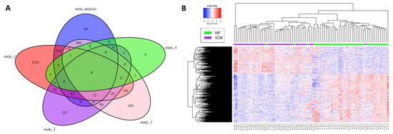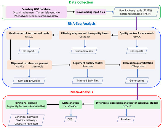 Table 1 summarizes four RNA-seq studies of ICM using tissue samples from human left ventricle, found in NCBI GEO [48] database (https://www.ncbi.nlm.nih.gov/geo/). Further, we did not include the datasets if they were not collected using the Illumina sequencing platform or they were collected in patients with any treatment of a specific drug or medically implanted device. The clinical information of ICM patients and their controls has been described in Study_1 [49], Study_2 [50], Study_3 [51] and Study_4 [14]. RNA-seq analyses of these four individual studies were previously published [49,50,52,53], thus all four individual datasets have been validated for our current meta-analysis. Detailed information of the data processing and bioinformatics analysis has been described in our recently published paper [32] and is shown in Figure 6. Briefly, FASTQ files were downloaded from the European Nucleotide Archive website (https://www.ebi.ac.uk/ena). Quality control for raw reads and trimmed reads was performed using FastQC [54]. Adaptors and low-quality bases (Phred quality score < 10) were filtered using Cutadapt [55]. A pipeline of HISAT2 [56], Samtools [57] and HTSeq-count [58] was used for aligning the trimmed reads to the human reference genome (GRCh38) and quantifying gene expression. Only uniquely mapped reads were used for expression quantification.