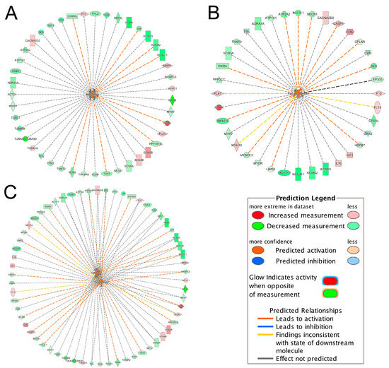 Interactions of significantly activated toxicity pathways with their associated DEGs. (A) arrhythmia; (B) failure of heart; (C) integrated toxicity pathways. For example, in Figure 2A, the gene TBX5 was downregulated as indicated by the green color and the downregulation of TBX5 further promoted (indicated by the orange dash line) the activation of arrhythmia, as indicated by the orange color. For other indicators, please refer to the Prediction Legend.