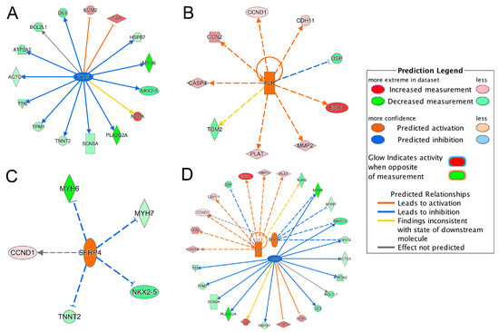 Inhibited/activated upstream regulators and their targeted genes. (A) TBX5; (B) F2R; (C) SFRP4; (D) An integrated network of TBX5, F2R and SFRP4. All the targeted genes were differentially expressed based on the meta-analysis. For example, the activation of F2R leads to the overexpression (indicated by the orange arrow line) of CASP4 (indicated by the red color). For other indicators, please refer to the Prediction Legend.