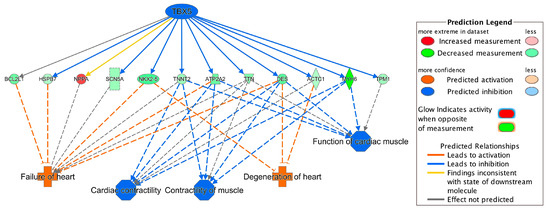 ACE2, SP100, CITED2, CEBPD, BCL3, CREB, SMARCA4, NCAM1 and SFRP4 have been previously reported as transcriptional regulators in heart failure [29,30,31,32,33,34]. Although CITED2, CREB5 (belongs to CREB family), CREB3L1 (belongs to CREB family), SMARCA4, NCAM1 and SFRP4 were significant DEGs in our dataset (Supplementary Table S1), only SFRP4 was identified as the significantly activated transcriptional regulator based on significant activation z-score (absolute z-score > 2.0) from our IPA analysis (Figure 4). Upstream regulator analysis also identified two additional transcriptional regulators, TBX5 and F2R (Figure 4). TBX5, a member of the T-box transcription factor family, was the top inhibited regulator. It has been previously reported that malfunction of TBX5 could lead to several cardiovascular diseases during embryonic development and also during adulthood [35]. In our study, inhibition of TBX5 was shown to dysregulate several genes such as DES, NKX2-5, ACTC1, MYH6, ATP2A2 and HSPB7, which further contributed to ICM-related diseases such as failure of heart and degeneration of heart (Figure 5). Cardiac muscle functions including cardiac contractility, contractility of muscle and function of cardiac muscles were also shown to be influenced due to inhibition of TBX5 (Figure 5). Consistent with our finding, TBX5 along with MEF2C has been reported to activate the expression of MYH6, which is considered as the building block of cardiomyocytes and plays a crucial role in heart development and function [36]. Moreover, DES expression has also been reported to be regulated by TBX5 [37] and a decreased number of DES-positive myocytes has been found in ischemic heart failure and was associated with reduced cardiac function [38]. Our study also found that dysregulated TBX5 could inhibit the expression of ATP2A2 (Figure 5), an ATPase enzyme that plays an important role in muscle contraction and relaxation, and decreased ATP2A2 has also been observed during human end-stage heart failure [39,40]. TBX5-regulated NKX2-5 is involved in heart formation and development and dysregulated NKX2-5 could lead to heart failure and sudden cardiac death [37,41]. Therefore, our results demonstrate a strong association of TBX5 with heart diseases and further propose its important transcriptional regulatory role in the development of ICM for future mechanistic studies.