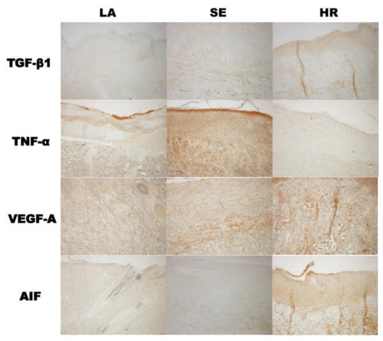 The results of immunohistochemistry were also in accordance with those of tissue Western blot. TGF-β1 and AIF were highly expressed in 4HR administered groups and TNF-α in the sericin group (Figure 6).