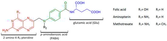 Methotrexate (MTX, amethopterin, Figure 1) is a synthetic organic compound, which belongs to an anti-folate therapeutic group and to class III of the Biopharmaceutical Classification System. It was created in the late 1940s as a less toxic derivative of aminopterin (Figure 1), then a folic acid (FA) antagonist used to treat children with acute leukaemia [1]. A few years later, it was noted that a low dose of aminopterin (1–2 mg/day) causes significant improvement in patients with rheumatoid arthritis (RA) [2] and in patients with psoriasis [3]. However, it was MTX that was introduced to clinical application in RA since the mid-1980s [4,5]. Currently, MTX is commonly applied in combination with other drugs for the treatment of many neoplasms (acute lymphoblastic leukaemia, acute myeloid leukaemia, meningeal leukaemia and lymphoma, osteosarcomas, non-Hodgkin’s lymphoma, also breast, bladder and number of other cancers) [6,7,8,9,10,11,12,13], severe and resistant forms of autoimmune diseases (rheumatoid arthritis, psoriasis, myasthenia gravis, Crohn’s disease, multiple sclerosis, polyarticular juvenile idiopathic arthritis) [4,5,6,7,14,15,16,17,18,19], or even an ectopic pregnancy [20].