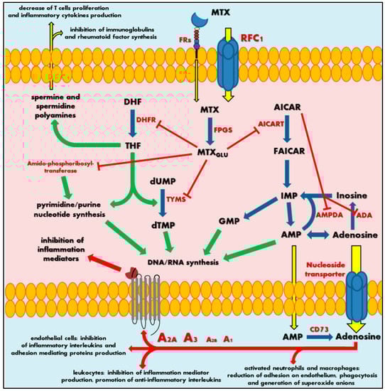 Scheme of mechanism of methotrexate action. MTX—methotrexate; MTXGlu—polyglutamated methotrexate; FRs—folate receptors; RFC1—reduced folate carrier 1; FPGS—folylpolyglutamyl synthase; DHF—dihydrofolate; DHFR—dihydrofolate reductase; THF—tetrahydrofolate; dUMP—deoxyuridine monophosphate; TYMS—thymidylate synthase; dTMP—deoxythymidine monophosphate; DNA—deoxyribonucleic acid; RNA—ribonucleic acid; AICAR—5-aminoimidazole-4-carboxamide ribonucleotide; AICART—5-aminoimidazole-4- carboxamide ribonucleotide transformylase; FAICAR—5-formamidoimidazole-4-carboxamide ribonucleotide; IMP—inosine monophosphate; GMP—guanosine monophosphate; AMPDA—adenosine monophosphate deaminase; ADA—adenosine deaminase; AMP—adenosine monophosphate; CD73—ecto-5′-nucleotidase; A1, A2A, A2B or A3—adenosine receptors. Green arrows represent stimulation, red arrows and sticks represent inhibition, blue arrows represent biochemical conversion, yellow arrows represent migration.