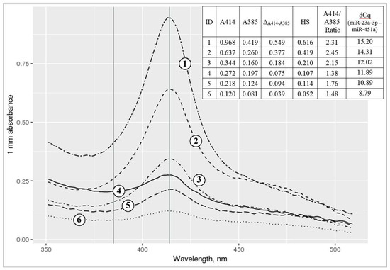 Spectrophotometric analysis of six different plasma supernatant samples in the 350–500 nm wavelength range. Left and right vertical lines correspond to 385 and 414 nm wavelengths. 1–2: hemolyzed samples with (1) and without (2) visually detected hemolysis, not included in the study; 3–6: samples with a low hemolysis degree, included in the study. Spectrophotometric data are supplemented by miRNA qPCR-based hemolysis assessment data.