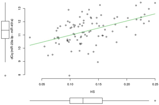 The results of the hemolysis assessment of plasma samples from the study groups are shown in Table 2. The dCq (miR-23a-3p–miR-451a) values in the studied samples ranged from 7.9 to 13.5. Appierto et al. [35] used a hemolysis score (HS) threshold of 0.057 to distinguish hemolyzed and non-hemolyzed plasma samples. In our study, HS values ranged from 0.01 to 0.25 (median 0.116), and only ~6% of samples had HS < 0.057. There were no significant differences in the values of any spectrophotometric-based hemolysis indices between the study groups. Among these indices, HS showed the highest association with dCq (miR-23a-3p–miR-451a) in the whole sample (adjusted linear R2 = 0.243, p = 4.876 × 10−7); despite the correlation between these two values (Spearman’s Rho 0.504, p < 0.05), HS did not reflect the miRNA ratio to a sufficient degree (Figure 2). Both HS and dCq (miR-23a-3p–miR-451a) values were used as confounding factors in multiple linear regression (MLR) analysis.