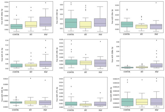 To estimate the presence of a combination effect of different miRNAs, we performed MLR analysis checking the interaction between at least two miRNAs for group comparisons, using age and hemolysis indices as confounding factors. As a result, we did not find any statistically significant interactions in the PAF vs. CONTR, PAF vs. HT, and PAF vs. CONTR+HT comparisons.