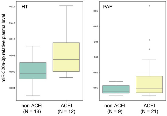 We also performed the same analysis within the HT group and observed a statistically significant increase in miR-320a-3p levels in HT patients receiving ACEI compared to those not receiving ACEI treatment (p = 0.039, Mann–Whitney test). In a combined PAF+HT group, we also observed a statistically significant increase in miR-320a-3p levels in patients receiving ACEI (p = 0.014, Mann–Whitney test). The plots of distribution of relative miR-320a-3p plasma levels in patients with and without ACEI treatment in HT and PAF groups are presented in Figure 4.