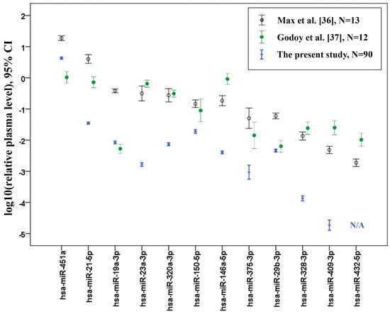 Comparison of miR-16-5p-normalized relative plasma levels between the present study and the two most recent miRNA plasma sequencing studies performed on healthy adults. Error bars represent the mean and 95% confidence interval (CI). N/A: not applicable.