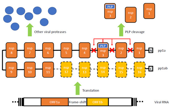 PLPs play their first role during the early replicative phase of coronavirus infection. After the virus enters the host cell, a replication/transcription complex (RTC) is required to orchestrate the replication of the viral units in the cytoplasm. Here, the PLPs’ cysteine protease activity is essential for the cleavage of the N-terminal segment of the RTC polyprotein (pp). Specifically, the RTC is coded by two open reading frames (1a and 1b), that, with a ribosomal frame shift mechanism, lead to the transcription of two polyproteins: pp1a, that features the nsps from 1 to 11, and the larger pp1ab, that, in addition, contains nsps 12 to 16. The pps need to be processed correctly into the nsps, which are the active elements of the RTC. PLPs are encoded within nsp3 and free the N-terminal nsps of the RTC, while the remaining units are processed by the three chymotrypsin-like cysteine protease (3CLP alias main protease), which may also serve as an attractive therapeutic target [5,6,26]. SARS and MERS CoVs are known to adhere to this model and a visual description of the SARS-CoV PLP role as a cysteine protease is given in Figure 1.