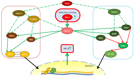 The host cell innate immune response to viruses begins once the viral nucleic acids are sensed by pattern recognition receptors such as Toll-like receptors (TLR) and retinoid inducible gene I (RIG-I). This event triggers signal cascades, including kinases such as TANK-binding kinase-1 (TBK1) and inhibitor-kB kinases (IKKs), leading to activation of transcription factors such as interferon-regulatory factor-3 (IRF3) and the nuclear factor kappa-light-chain-enhancer of activated B cells (NF-kB). These proteins translocate into the nucleus and serve as transcription factors by binding to promoter elements in target genes, leading to the expression of several cytokines, including type I IFNs (as α and β IFNs), which in turn will trigger a huge number of intra and extra cellular processes leading to activation of the innate immune response [27].