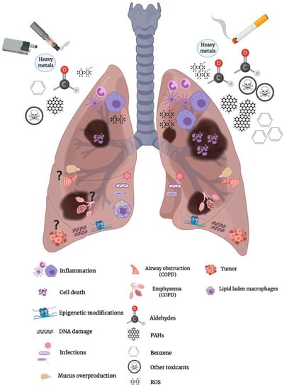 The known and unknown health effects of vaping in comparison to cigarette smoke. The major toxic effects of compounds found in cigarette smoke (Right lung) and in vaping aerosols (Left lung) are lunginflammation, oxidative stress, cell death, impaired immune response, DNA damage and epigeneticmodifications. The respiratory diseases caused by cigarette smoke (lung cancer, COPD [emphysema and/orobstruction of airways]) are not yet established to be caused by vaping (represented by question marks in theleft lung). The presence of lipid-laden macrophages is a feature predominantly associated with vaping products containing THC and has been a feature of EVALI.