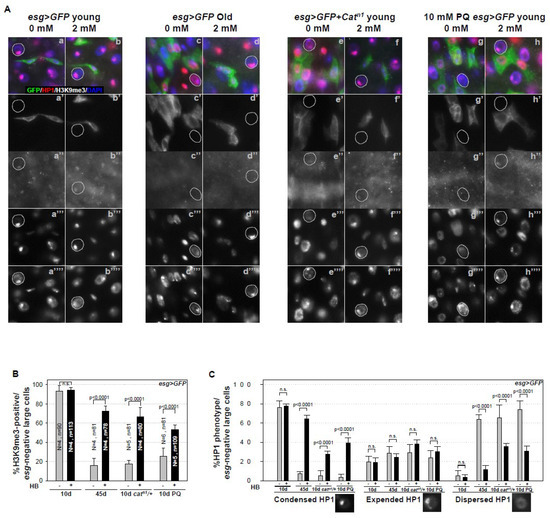 A previous study reported the age- and oxidative stress-related loss of heterochromatin stability due to the loss and dispersion of tri-methylated histone H3 Lys 9 (H3K9me3) and heterochromatin protein1 (HP1) in midgut ECs, as niche aging [49]. HP1 is a crucial heterochromatin component that binds H3K9me3 [50]. We examined the age- and oxidative stress-induced increases of heterochromatin instability in ECs after aging and oxidative stress exposure while using anti-H3K9me3 and anti-HP1 antibodies. Single-spotted H3K9me3 foci in the nuclei of ECs (esg-negative large cells) were clearly detected in 10-day-old esg > GFP flies (Figure 3A(a–a’’)). In 45-day-old esg > GFP (93.05% to 15.76%, Figure 3A(c–c’’),B), 10-day-old esg > GFP + Catn1 (93.05% to 17.46%, Figure 3A(e–e’’),B), and PQ-treated esg > GFP (93.05% to 25.18%, Figure 3A(g–g’’),B) flies, single-spotted H3K9me3 foci were significantly deceased in the EC nuclei. Following β-HB treatment, age- and oxidative stress-related loss of H3K9me3 foci in the nuclei of ECs was recovered in 45-day-old esg > GFP flies (15.76% to 72.2%, Figure 3A(d–d’’),B), 10-day-old esg > GFP + Catn1 flies (17.46% to 66.37%, Figure 3A(f–f’’),B), and PQ-treated esg > GFP flies (25.18% to 53.16%, Figure 3A(h–h’’),B), as compared to non-treated flies (Figure 3A(c–c’’, e–e’’, g–g’’)). These data indicate that the age-dependent diminishment of H3K9me3 can be rescued by β-HB treatment. Simultaneously, we investigated the effect of β-HB on age-related changes of HP1 in midgut ECs. We categorized HP1 phenotypes into three types, designated as condensed (single-spotted and strong signal), expanded (single-spotted but branched or ring-shaped, and weak signal), and dispersed (dispersed throughout the nucleus, or almost no signal), to quantify HP1 signals in ECs. Single- and condensed-spotted HP1 in the nucleus of ECs (esg-negative large cells) was clearly detected in 10-day-old esg > GFP flies (Figure 3A(a–a’’’)). This is consistent with age-related loss, expansion, or dispersion of HP1 detected in ECs (esg-negative large cells), when compared to control flies (Figure 3A(c–c’’’, e–e’’’, g–g’’’)). Age- and oxidative stress-related losses of HP1 in the ECs nuclei were recovered by β-HB treatment in 45-day-old esg > GFP (Figure 3A(d–d’’’)), 10-day-old esg > GFP + Catn1 flies (Figure 3A(f–f’’’)), and PQ-treated esg > GFP flies (Figure 3A(h–h’’’)), as compared to the non-treated flies (Figure 3A(c–c’’’, e–e’’, g–g’’’)). Following β-HB treatment, age- and oxidative stress-related decrease of the proportion of condensed HP1 type in ECs was significantly recovered in 45-day-old esg > GFP flies, 10-day-old esg > GFP + Catn1 flies, and PQ-treated esg > GFP flies, as compared to the non-treated flies (Figure 3C). These results indicate that β-HB treatment markedly rescues age- and oxidative stress-induced loss or dispersion of HP1 in ECs. These results suggest that age- and oxidative stress-related increases of heterochromatin instability in ECs, a niche aging, can be decreased by β-HB treatment.