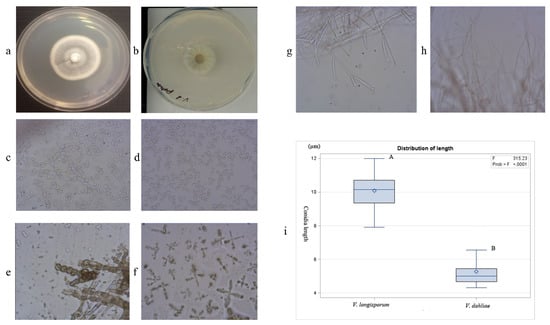 Morphological comparison of isolate VL-H1 of Verticillium longisporum (a,c,e,g) with Vd1396-9 of Verticillium dahliae (b,d,f,h). (a,b) Culture characteristics of Verticillium isolates; (c,d) Conidia observation (×40); (e,f) Microsclerotia (×40); and (g,h) Hyphae (×40). (i) Statistical analysis of V. longisporum and V. dahliae conidia length.