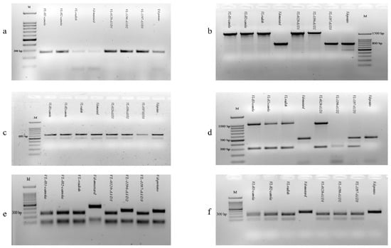 To further confirm the identification of Verticillium isolates, regions of the mitochondrial small-subunit rRNA gene and the cytochrome b gene were amplified with the primer pairs NMS1/NMS2 and cobF1/cobR1, respectively [,] (Table 2). The amplicons of 584 bp for mtSSU-rDNA and 320 bp for the cytochrome b gene were then digested using the restriction enzymes MseI and DdeI (New England BioLabs, Ipswich, MA, USA), respectively. The digested products were separately visualized in 1.5% agarose gels, as described above.