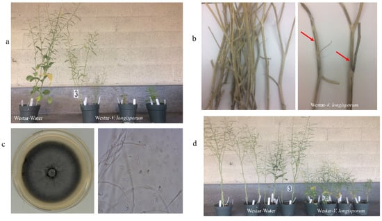 The Westar plants inoculated with V. longisporum showed disease symptoms in the form of yellowing and chlorosis at 7 and 14 days post-inoculation (dpi) (Table 1). The mean scores of disease severity were significantly higher in the plants infected with the V. longisporum isolates identified in this study than in those inoculated with water after 14 and 21 dpi (Table 1). After 35 dpi, the plants inoculated with V. longisporum produced symptoms such as a short height, leaf yellowing, chlorosis, leaf senescence and plant stunting (Figure 3a, Table 1), and approximately 17% of the V. longisporum-inoculated plants were dead. The V. longisporum and V. dahliae isolates, identified from radish and mustard, respectively, caused similar symptoms and disease severity on canola Westar plants (Table 1). After harvest, the stems infected with V. longisporum displayed streaking, striping or blackening, and microsclerotia were observed on the stems (Figure 3b). V. longisporum isolates were recovered and confirmed from the infected stems of the canola plant, showing similar morphological characteristics (Figure 3c). Westar plants were inoculated by the recovered V. longisporum isolates, and showed dwarfed and stunted plant growth, which indicated that the recovered V. longisporum isolate is the causal agent of Verticillium stripe disease in canola (Figure 3d).