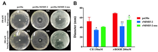 MiMIF-2 expression in Escherichia coli exhibited resistance to organic peroxide; (A) Sensitivity to cumene hydroperoxide (CH) or t-butyl hydroperoxide (t-BOOH), measured in the filter disc assay in Escherichia coli expressing MiMIF-2 or MiMIF-2-mu. Cells containing the empty plasmid pet30a were used as controls. The numbers indicate summary statistic data for Petri dishes with similar results. The experiments were performed three times; (B) Diameters were measured to assess the difference between treatments. The bar represents the mean ± SD of six independent measurements. *, ** indicates significant difference in one-way ANOVA with Dunnett′s multiple comparisons test (Alpha 0.05). The experiment was repeated three times with similar results.