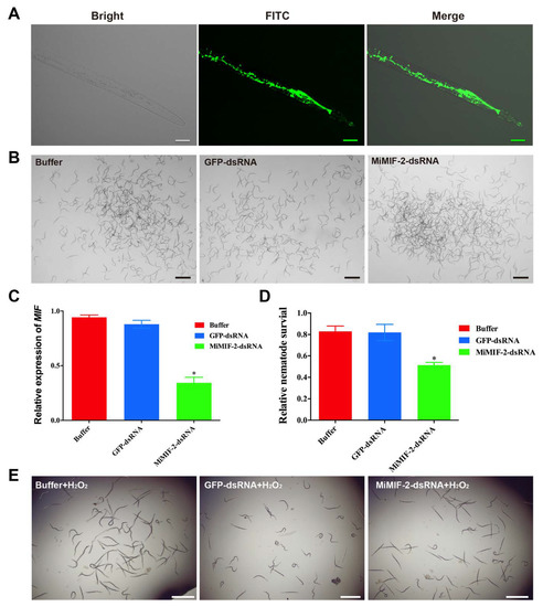 In vitro RNAi silencing of MiMIF-2 in pre-parasitic M. incognita J2; (A) Fluorescence microscopy investigation showed ingestion of fluorescein isothiocynate (FITC) in the treated M. incognita pre-J2 s. Scale bars, 20 µm; (B) phenotypes of M. incognita pre-J2 s after treatment with buffer, GFP-dsRNA or MiMIF-2-dsRNA. Scale bars, 50 µm; (C) relative expression levels of MiMIF-2 after soaking in the buffer, GFP-dsRNA or MiMIF-2-dsRNA. The relative expression of MiMIFs was quantified by RT-qPCR. The tubulin gene was used as an internal control, and fold-change values (mean ± SE) were calculated relative to the buffer value by the 2−ΔΔCt method. * indicates significant difference in one-way ANOVA with Dunnett′s multiple comparisons test (Alpha 0.05). The data shown are from one of three independent experiments; (D) MiMIF-2-dsRNA or buffer-treated nematodes were incubated with 10-mM H2O2. Living nematodes were counted after treatment 4 h. Asterisks indicate significant differences relative to the mean ±SD values for the control treatment in Student’s t-test (p < 0.05). The experiments were performed three times and three biologic replicates showed similar results; (E) phenotypes of nematodes after treatment with dsRNA and H2O2. Scale bars, 50 µm.