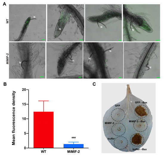 H2O2 visualization in nematode infected Arabidopsis roots and H2O2 detection after co-expression MiMIF-2 and Bax in N. benthamiana leaves; (A) CM-H2DCFDA staining of ROS in wild-type (WT) and MiMIF-2 expressing (MiMIF-2-3 and MiMIF-2-4) roots after M. incognita infection. Images were captured by confocal microscopy (LeicaSP8) 1-day post inoculation (dpi). Scale bar, 50 µm. N, nematode; (B) Relative fluorescence density between wild type and MiMIF-2 expressing Arabidospsi after M. incognita infection. *** indicates significant difference in the Student’s t-test (p < 0.001). (C) H2O2 production in N. benthamiana leaves was assessed by 3,3′-Diaminobenzidine (DAB) staining. N. benthamiana leaves were infiltrated with Agrobacterium tumefaciens carrying the corresponding constructs, and measurements were performed at 2 dpi. Three independent assays were conducted and at least 5 plants and/or 15 leaves were observed.