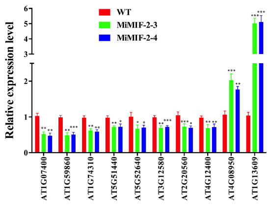 RT-qPCR verification of candidate differentially expressed genes (DEGs) between wild type and MiMIF-2 expressing Arabidopsis. The relative expression levels of 8 heat-shock-like proteins and 2 upregulated genes were analyzed by RT-qPCR and normalized using UBP22 (AT5G10790) as the internal control. Data represent the mean fold-change ± SE. Mean values significantly different from wild type (*, **, ***) were determined by one-way ANOVA with Dunnett′s multiple comparisons test (Alpha 0.05). The experiment was repeated three times with similar results.