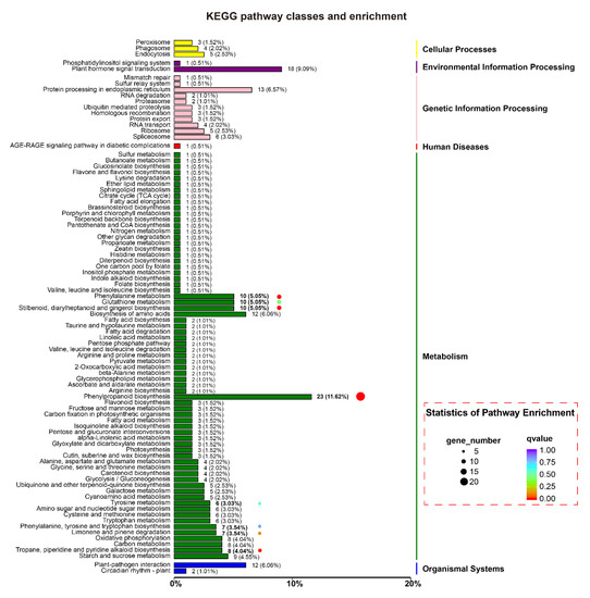 KEGG pathway enrichment of differentially expressed genes (DEGs) in MiMIF-2 expressing Arabidopsis after treatment with flg22. DEGs were classified into 6 processes (cellular processes, environmental information processing, genetic information processing, human diseases, metabolism and organismal systems). MiMIF-2 expressing in Arabidopsis affected some cellular pathways, especially phenylpropanoid biosynthesis, phenylalanine metabolism, glutathione metabolism, plant hormone signal transduction and plant–pathogen interaction.