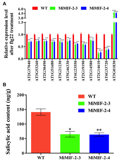 2.6. Defense-Associated Genes Were Down Regulated and Salicylic Acid (SA) Content Was Decreased in MiMIF-2 Expressing Arabidopsis after Treatment with flg22