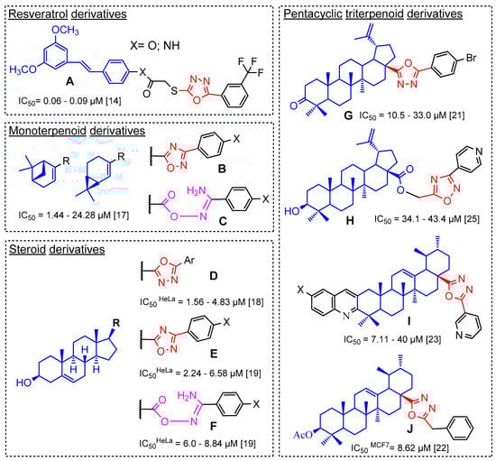 Structures of semisynthetic derivatives of natural compounds bearing oxadiazole (A,B,D,E,G–J) and amidoxime (C,F) moieties that display promising antitumor activity.