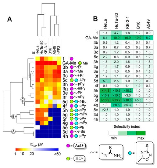 On the first step of the biological evaluation of novel GA derivatives 3a-h, 4a-h, and 5a-h, we analyzed their cytotoxicity in a panel of cultured mammalian cells, including human cervical carcinoma HeLa and KB-3-1, human duodenal carcinoma HuTu-80, human lung adenocarcinoma A549, murine melanoma B16 cell lines, and nontransformed human fibroblasts hFF3. The cells were treated with derivatives for 48 h and cell viability was evaluated by 3-(4, 5-dimethylthiazol-2-yl)-2, 5-diphenyltetrazolium bromide (MTT) assay. Since the studied compounds contain two types of functional groups at position 3-acetoxy- or the hydroxyl-group, 3-acetoxy-GA 1 and GA-Me were used as references. The obtained IC50 values of compounds are summarized in Table 1. Additionally, hierarchical clustering of cytotoxic data was carried out in order to reveal groups of compounds with similar cytotoxic profiles (Figure 2A).