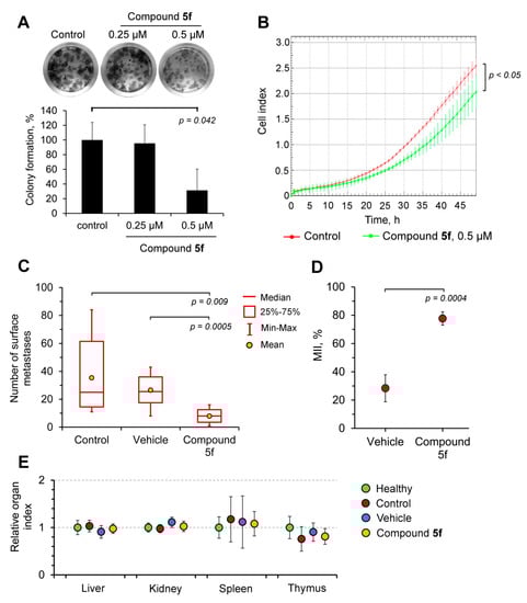 Compound 5f displays significant antimetastatic potential. (A) Compound 5f inhibits the clonogenic activity of HeLa cells. HeLa cells were seeded at a low density and treated by 5f (0.25, 0.5 µM) for 14 days followed by fixation of the cells and their staining with crystal violet. The assessment of the colony formation level was carried out using a ColonyArea ImageJ plugin. (B) Compound 5f inhibits the motility of HeLa cells. HeLa cells were seeded into the upper chamber of the cell invasion/migration (CIM)-Plate and treated by 5f at 0.5 µM for 48 h. FBS-mediated migration of the cells to the lower chamber was analyzed by impedance measurement in real time regimen using the xCELLigence Real-Time Cell Analyzer Dual Plates (RTCA DP) system. (C) Administration of 5f significantly suppresses the metastatic growth of B16 melanoma in vivo. Compound 5f (50 mg/kg) was intraperitoneally injected in B16 melanoma-bearing mice five times. At day 14 after tumor cell transplantation, mice were sacrificed and a number of surface metastases in the lungs were counted. Then, 10% Tween-80 in physiological salt solution was used as the vehicle. (D) Metastatic inhibition indexes (MII) of mice treated by a vehicle or compound 5f. MIIs were calculated relatively to control B16 melanoma-bearing untreated mice. (E) Compound 5f does not cause toxic effects in mice. Liver, kidney, spleen, and thymus indexes of mice in tested groups were calculated relative to the organ indexes of healthy mice.