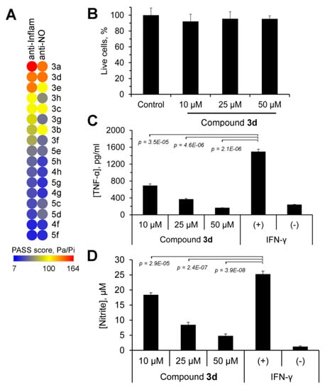 The performed MTT assay confirmed that compound 3d did not affect cell viability—the treatment of murine RAW264.7 macrophages by 3d at concentrations up to 50 µM for 24 h did not reveal cytotoxicity (Figure 5B).