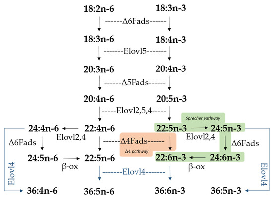 Biosynthetic pathways of long-chain (LC-PUFA; C20–24) and very long-chain polyunsaturated fatty acids (VLC-PUFA; >C24) in fish. Desaturation reactions are mediated by fatty acyl desaturases (Fads), whereas elongation reactions are catalyzed by elongation of very long-chain fatty acid (Elovl) proteins. Microsomal β-oxidation reactions are denoted as “β-ox”. Two pathways for docosahexaenoic acid (DHA; 22:6n-3) biosynthesis from docosapentaenoic acid (DPA; 22:5n-3) are indicated, namely the Sprecher pathway (green background) and the Δ4 pathway (orange background). Elongation reactions leading to VLC-PUFA biosynthesis of up to C36 are indicated with blue arrows. Note the fish species studied herein (Sparus aurata and Solea senegalensis) lack elovl2 in their genomes [2].