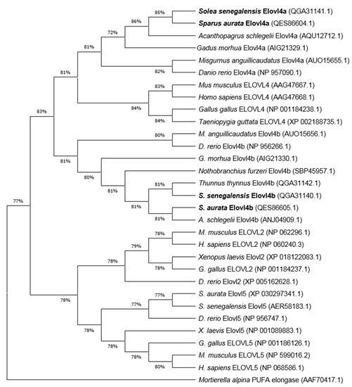 Phylogenetic tree comparing Sparus aurata and Solea senegalensis Elovl4a and Elovl4b proteins (highlighted in bold) with Elovl2, Elovl4 and Elovl5 proteins from other vertebrates. The tree was constructed while using the Maximum Likelihood method and Jones-Taylor-Thornton (JTT) matrix-based model. The numbers in branches represent the frequencies (%) of each node after 1000 iterations by bootstrapping. The Mortierella alpina PUFA elongase was included in the analysis as an outgroup, to construct the rooted tree.