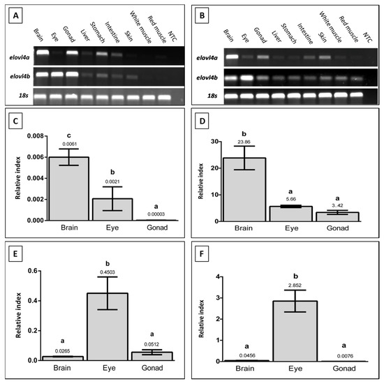 Selected tissues of both fish species were then analyzed by real-time quantitative reverse transcriptase PCR (qPCR) in order to obtain quantitative values of elovl4a and elovl4b expression (Figure 3C–F). For gilthead seabream, significant differences (p ≤ 0.05) were found in elovl4a expression between all tissues, with the highest levels of mRNA in brain, followed by eye, and finally gonad (Figure 3C). For elovl4b, the highest expression was found in eye, while the brain and gonad showed significantly lower expression values (p ≤ 0.05) (Figure 3E). Similarly, a differential expression of elovl4 genes was detected in the tissues of Senegalese sole (p ≤ 0.05). For elovl4a, significantly higher expression was found in brain, with a lower expression being measured in the eye and gonad (Figure 3D). In the case of elovl4b, the highest expression levels were detected in eye, with brain and gonad having significantly lower expression levels (Figure 3F).