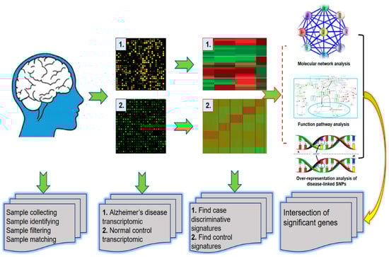 Differentially expressed genes (DEGs) are important targets in the discovery of biological pathways involved in different diseases, such as cancers or neurological diseases. The goal of DEG analysis is to find genes that could be up- or downregulated in disease, compared to unaffected controls. Over- or underexpression of different genes may result in alterations in metabolic, immune, and other pathways, leading to diseases [15,16]. DEGs could also impact the onset of neurodegenerative diseases, including Alzheimer’s disease. In addition, variations may be possible between the gene expression patterns of different brain areas [17]. It is important to find out whether the transcriptional changes could result in additive effects in the known disease risk factors and disease-related pathways. The occurrence of AD may increase with age, and abnormal transcriptional changes result in disease-associated mechanisms [18,19].