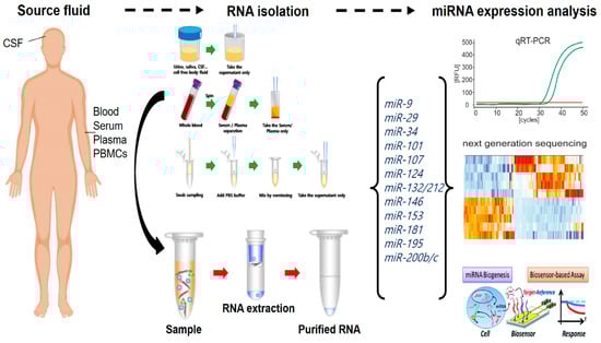 MicroRNAs are composed approximately 20 nucleotides and bind to the 3‘- UTR region of target mRNAs. This binding may result in blocking the translation of certain genes or in the degradation of mRNA. MiRNAs play an important role in the regulation of brain functions and neuronal development. Imbalance in miRNA expression was verified as an important factor in AD-related pathways [38]. Expression of miRNAs may be up- or downregulated in AD. MiRNAs may act through aging, and they could reduce the neuroprotection and induce inflammatory mechanisms, oxidative stress, or protein misfolding. MiRNAs may be associated with AD through APP processing, amyloid formation, and Tau phosphorylation. In addition, exosomal miRNAs within biological fluids are known as promising disease-related markers and have emerged as a powerful tool for solving many difficulties in both the diagnosis and treatment of AD patients. In AD, for example, miRNA profiling experiments (in brain tissue) have resulted in the identification of many disease-specific miRNAs that have been confirmed independently in many studies [39]. For example, hsa-miR-106, hsa-miR-153, and hsa-miR-101 have been shown to modulate APP [40,41,42], while beta secretase 1 (BACE1) has been shown to be targeted by hsa-miRNA-29 and hsa-miR-107, linking miRNAs to the regulation of amyloid production in AD brains [43]. Based on similar studies, researchers have focused on these disease-specific miRNAs to determine if differential levels are found in more-easily accessible biofluids like blood or CSF. Table 1 introduces several miRNAs involved in different AD-associated mechanisms, including amyloid metabolism, Tau pathology, immune mechanism, or cell death. MiRNAs in biofluids (blood, plasma, serum, saliva) were believed to be promising markers for AD diagnosis [44]. For better understanding of the disease mechanisms and for early detection and diagnosis of AD, the generation of miRNA panel should be critical (Figure 2).