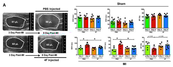 Male C57BL/6J mice 10–12 weeks of age were used for these studies. Acute MI was induced by subjecting mice to open-chest left coronary artery ligature occlusion and reperfusion (I/R) under 1.5%–2.0% isoflurane inhalation anesthesia as described previously [,], but with an ischemic time of 60 min followed by extended reperfusion. Sham-operated mice served as controls. Mice were assessed at day 3 post-MI by echocardiography, and mice with similar degrees of myocardial injury (or sham control mice) were randomized to receive either L-4F (100 μg/day in 200 μL of PBS) or PBS vehicle (200 μL/injection) via the tail vein for 5 consecutive days. This dose of L-4F was based on a previous study evaluating the efficacy of L-4F in inhibiting LDL aggregation []. After 5 days of treatment, echocardiography was repeated, peripheral blood was collected, and the mice were sacrificed and tissue processed for immune cell analysis by flow cytometry. The project was approved by The University of Alabama at Birmingham Institutional Animal Care and Use Committee (IACUC) on 3 October 2017 (IACUC-21091).