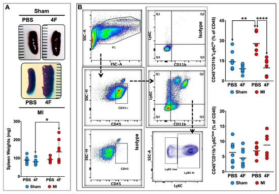 As the spleen is an important source of circulating monocytes and monocyte-derived infiltrating tissue macrophages after acute MI [,], we next evaluated the effects of L-4F on the spleen at the same time point as in Figure 2. L-4F augmented spleen weight in MI mice as compared with L-4F-treated sham-operated mice (Figure 3A). Representative flow cytometry gates for splenic monocytes and corresponding quantitation of Ly6Chi and Ly6Clow monocytes are shown in Figure 3B. Analogous to blood monocytes, PBS-treated MI mice exhibited significantly increased (~2-fold) frequency of pro-inflammatory Ly6Chi monocytes in the spleen at 8-day post-MI (as compared with sham mice), which was markedly suppressed and normalized in L-4F-treated MI mice. Hence, pro-inflammatory blood and splenic monocytes were particularly sensitive to L-4F and were impacted in parallel, suggesting that L-4F reduced abundance and trafficking of splenic Ly6Chi monocytes to the heart after MI. These effects may in part underlie the reported anti-inflammatory properties of L-4F in vivo.
