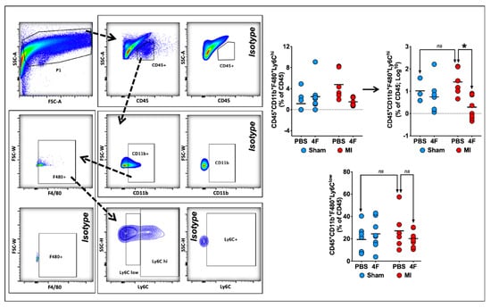 L-4F decreases myocardial pro-inflammatory macrophage expansion in infarcted hearts. Left panel: Gating strategy for flow cytometric evaluation of cardiac macrophages. Right panel: Quantitative group data for macrophage abundance in sham-operated and infarcted hearts after PBS or L-4F treatment for 5 days, starting at 3-day post-surgery. Statistical comparisons were performed after logarithmic data transformation to satisfy the normality assumption as described in the text. Data are presented as percent CD45+ cells by flow cytometry, n = 6–8/group, * p < 0.05. ns—not significant.
