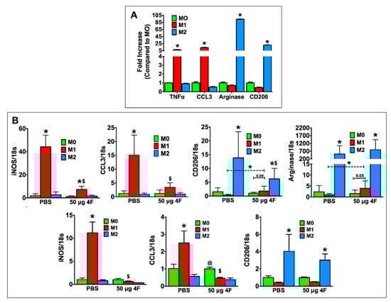 Peritoneal macrophages were isolated by lavage from mouse peritoneum following 5 days of thioglycolate elicitation as previously described []. Peritoneal isolates from 6 mice were pooled and used for subsequent studies. After removal of non-adherent cells and following overnight incubation in culture media (DMEM, 10% FBS, 1% antibiotics), adherent macrophages were subjected to polarization for 4 h in serum-starved culture media. M1 polarization was induced by lipopolysaccharide (1 μg/mL) and interferon(IFN)-γ (4 ng/mL) treatment, whereas M2 polarization was induced by interleukin (IL)-4 (20 ng/mL) and IL-10 (20 ng/mL) []. Naïve cultured un-stimulated cells were considered as undifferentiated M0 cells. Following polarization, cells were washed and cultured in serum-free culture media for 2 h and treated overnight with either L-4F (50 μg/mL) or PBS. Similar studies were performed on the mouse macrophage cell line RAW 264.7 (ATCC TIB-71). At the end of the experiment, cells were washed and processed for RNA isolation and subsequent RT-PCR analysis.